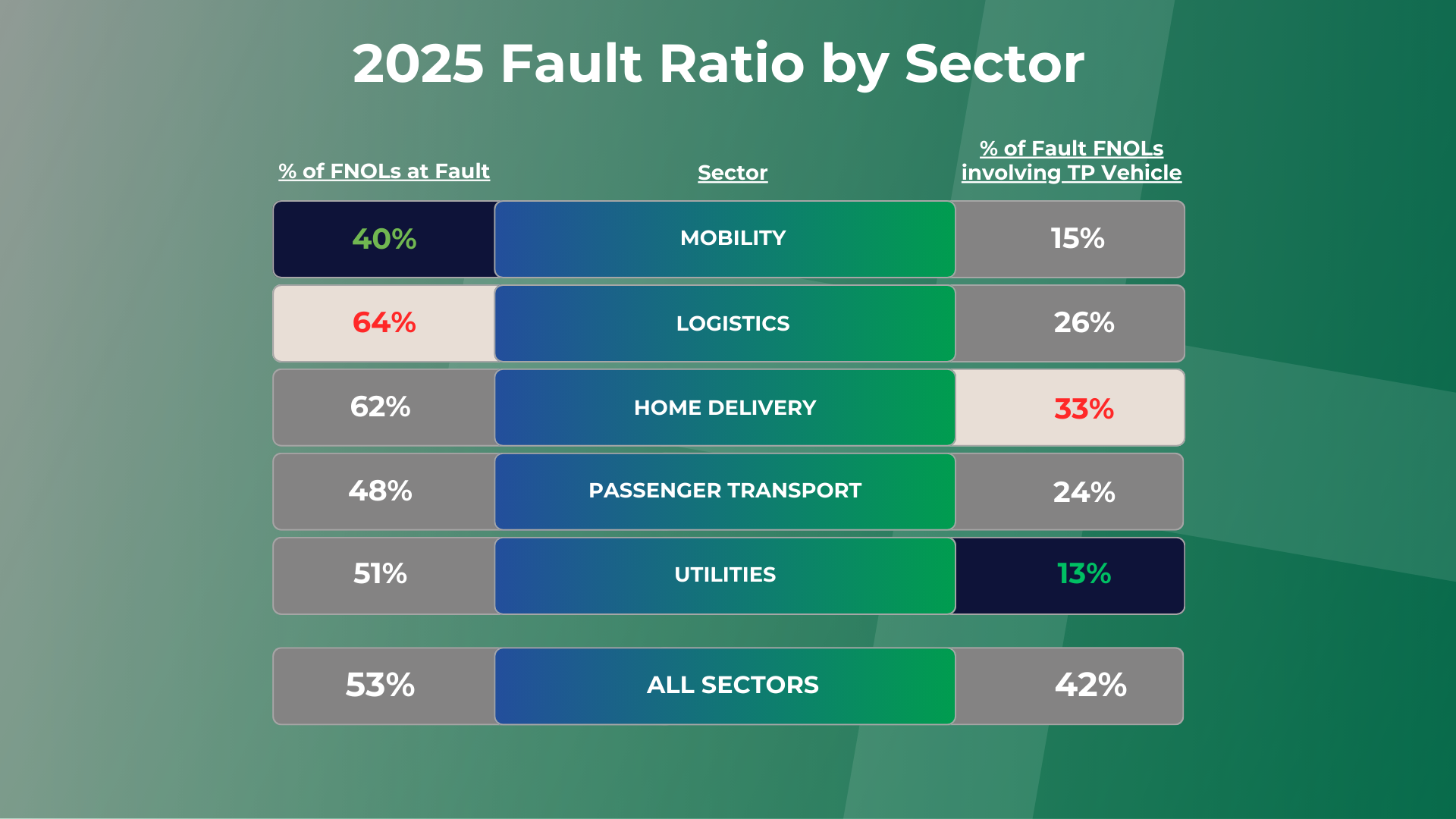A clearer idea of risk forms when analysing fault ratios and third-party involvement. It’s important to note that different fleet sectors behave very differently when it comes to fault liability: