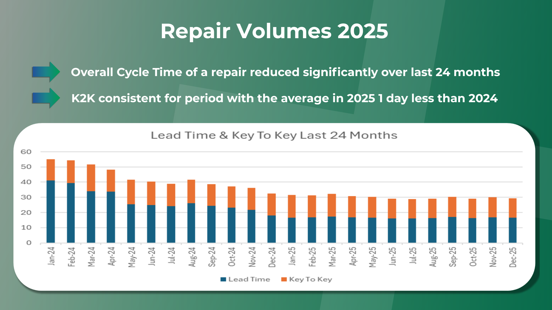 Encouragingly, repair cycle times have improved significantly over the past 24 months. 2025 represents the strongest Key-to-Key performance since summer 2021, with average cycle times one day shorter than 2024.